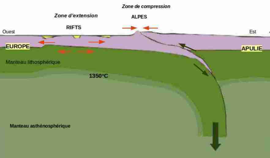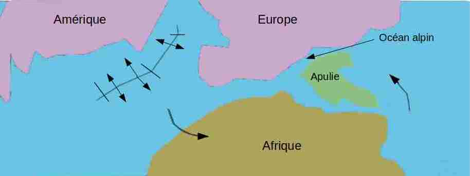 L’ouverture de l’Océan Atlantique à partir de – 180 Ma entraîne le déplacement des plaques lithosphériques. A partir de – 100 Ma la plaque portant le continent européen s’enfonce progressivement sous l’Apulie (micro-plaque appartenant à l’origine au continent africain), ce qui entraîne le serrage puis la fermeture de l’Océan alpin et donc la collision entre les deux continents, à l’origine de la formation des Alpes, qui commence il y a 60 millions d’années.