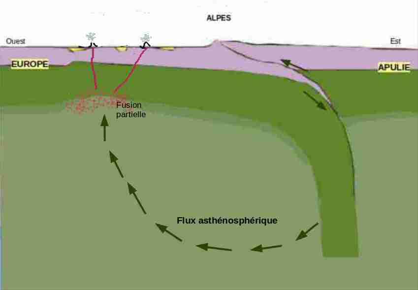 Si ce processus est suffisamment important et dure suffisamment longtemps (plusieurs millions d’années), un réchauffement de la base de la lithosphère peut se produire et la décompression de la péridotite chaude qui remonte peut provoquer une fusion partielle des roches … et donc un magma… qui peut remonter par les failles… et donc des volcans !