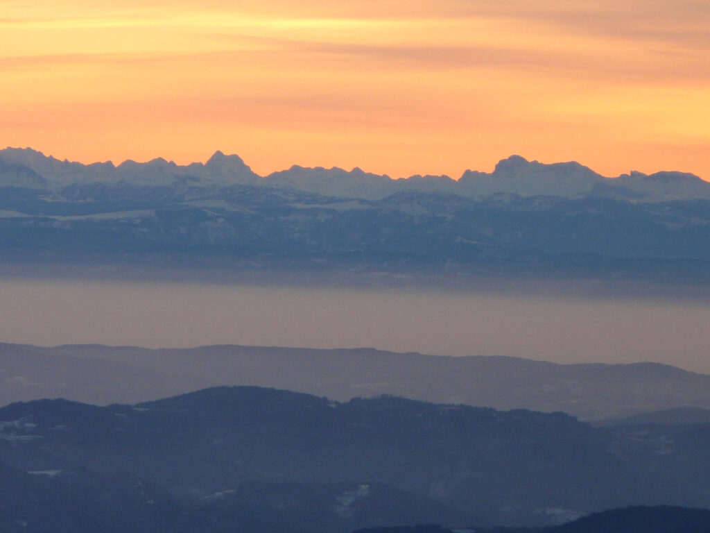 Les Alpes vues depuis le pays des Sucs. Entre les deux, la vallée du Rhône est dans la brume…