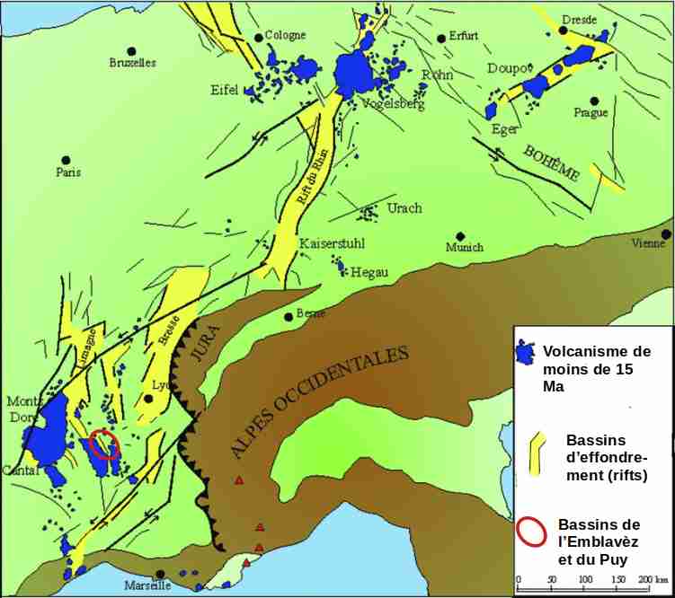 Les bassins de l’Emblavèz et du Puy-en-Velay font partie d’un ensemble de fossés d’effondrement (même si l’effondrement est très lent !) ou rifts, ou graben, limités par des failles normales et qui sont la conséquence d’une distension de la croûte terrestre.