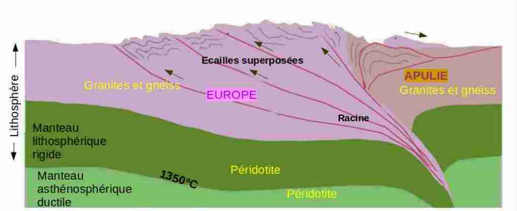 Le manteau de la lithosphère, dense et lourd, peut s’enfoncer dans l’asthénosphère chaude plus ductile. La formation de cette racine profonde est datée d’environ 35 Ma.