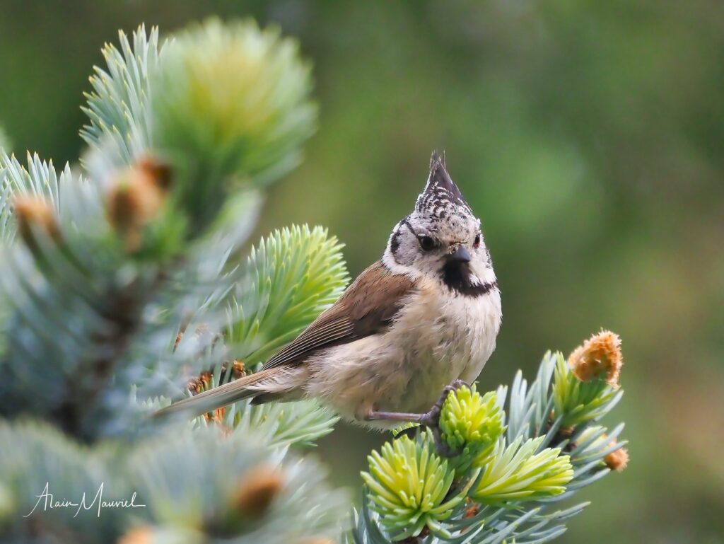 La Mésange huppée se distingue de toutes les autres mésanges par sa huppe pointue, tantôt rabattue, tantôt crânement dressée. Colocataire des conifères avec la mésange noire, elle forme en hiver avec cette dernière de petites troupes errantes dans nos forêts. Les deux peuvent arriver jusqu’à nos mangeoires…