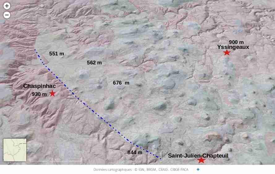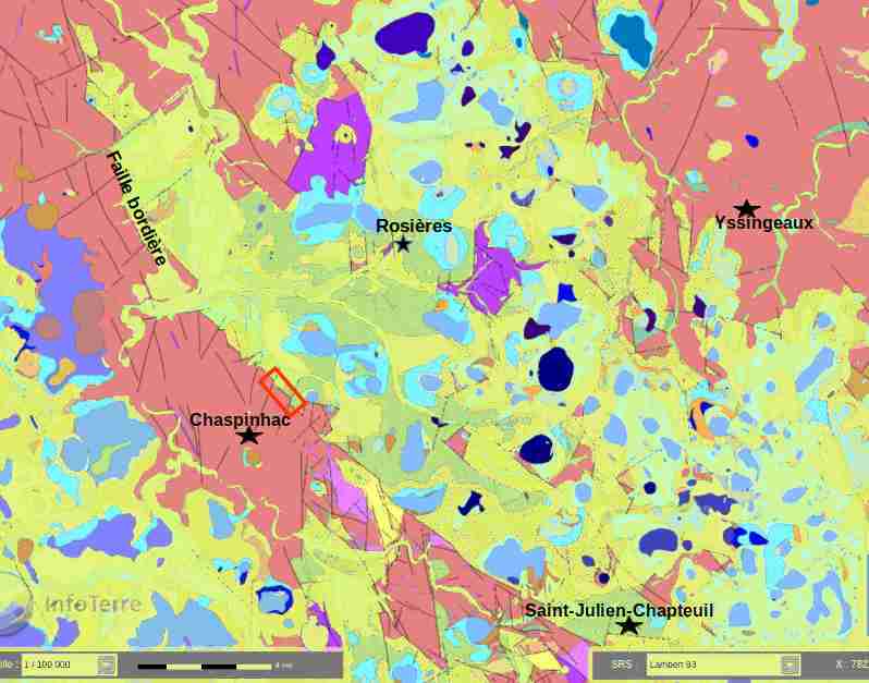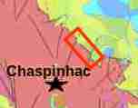 Les plateaux granitiques (de couleur rose) de Chaspinhac d’une part et d’Yssingeaux d’autre part, à 900 m d’altitude environ, surplombent de plus de 300 m une dépression dans laquelle pointent un certain nombre de volcans phonolitiques (en bleu-vert). Cette dépression constitue le bassin de l’Emblavez. La limite entre le bassin et le plateau de Chaspinhac est rectiligne.