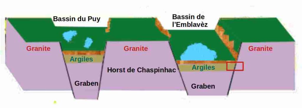 Dans notre région les forces distensives ont duré plusieurs millions d’années au cours desquelles le bassin de l’Emblavès, comme celui du Puy se sont progressivement enfoncés. Les produits de l’érosion des plateaux se sont sédimentés dans des lacs sous forme d’argiles essentiellement.