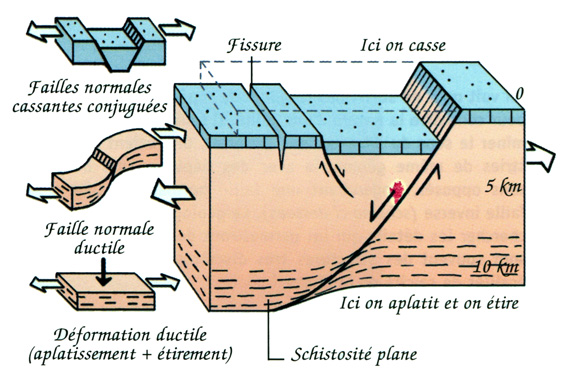 A la surface de la terre les roches, rigides, se fracturent lorsqu’elles sont soumises à des contraintes : compression, distension, ou cisaillement. En profondeur les terrains sont plus ductiles et le comportement sera différent.
