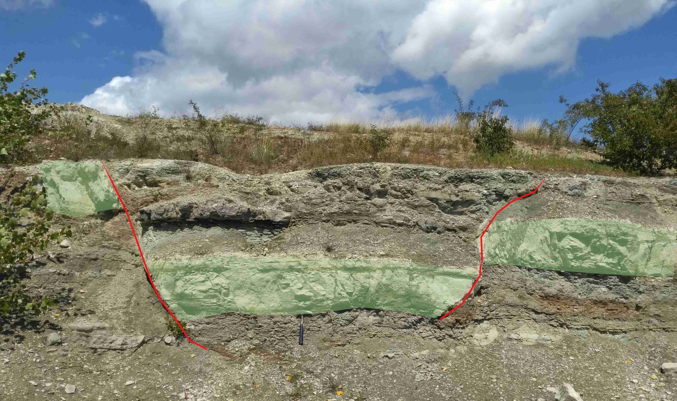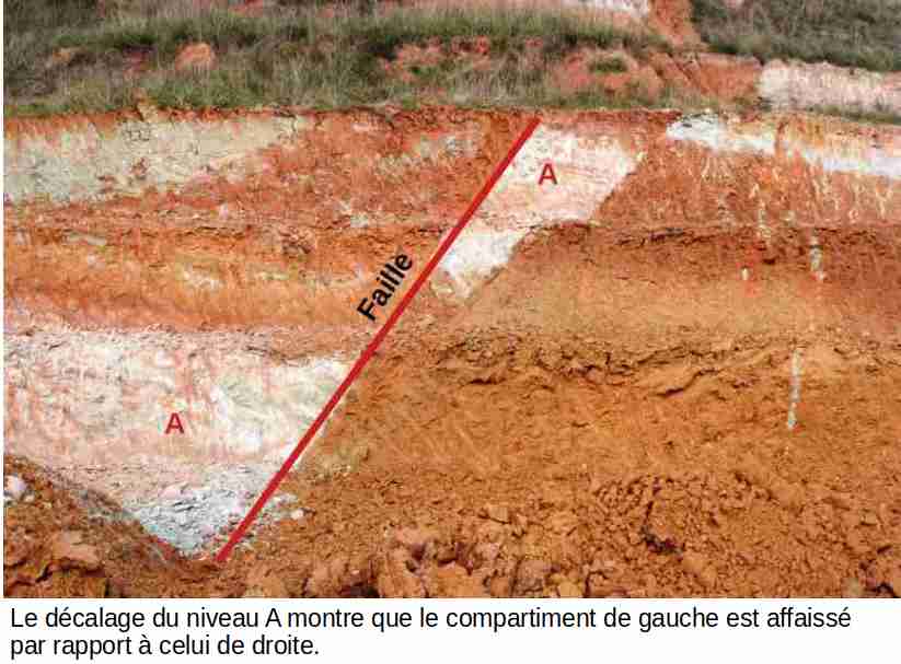 Les terrains affleurent dans une carrière sous forme de strates de couleurs différentes, ce qui permet de visualiser un faisceau de petites failles à l’échelle de l’affleurement.