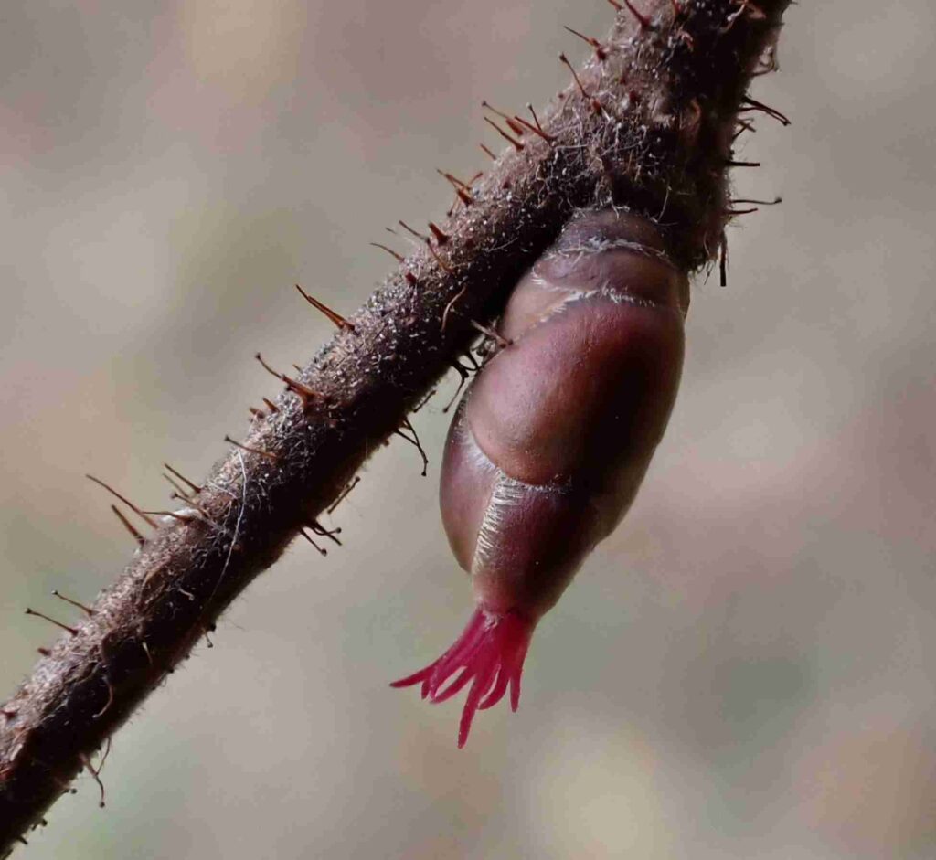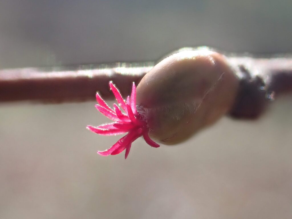 Quelles sont les fleurs cachées dans ce bourgeon, dont seules les petites houppes rouges sont visibles, qui vont faner sans avoir dévoilé davantage leurs parties intimes, ce qui ne les empêchera pas de devenir des fruits très appréciés …? Quels fruits ?