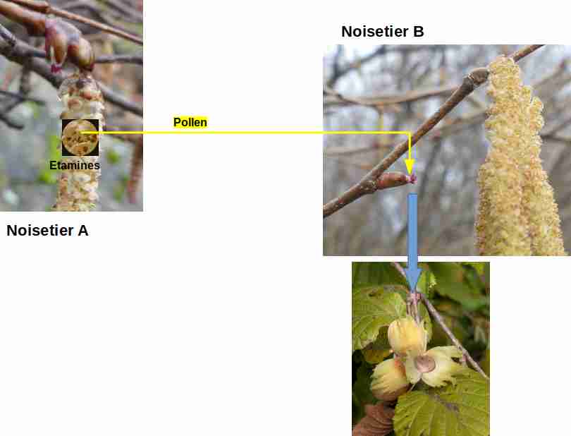 Les chatons du noisetier sont les fleurs mâles qui produisent le pollen. Pour cause d’incompatibilité le pollen produit ne peut pas féconder les fleurs femelles du même noisetier, la fécondation est croisée.